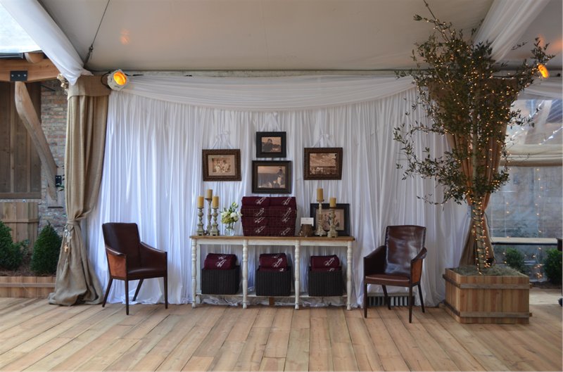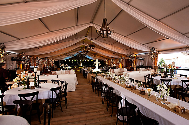 A tent wedding come in a variety of sizes. The example below is a very large tent wedding that was designed with the assistance of an interior decorator to showcase the bride and groom’s personal style. The room was the size of a football field. The tent was nestled in between two buildings which are an upscale barn for polo horses. It was quite a notch above most stables! The room held about 800 people with seating designed for about 300. The goal was to allow for an intermingling of family and friends. This was achieved by having enough seating for people that wished to sit and eat, a dance floor, food stations, and lounge staging spaces. Most didn’t even realize they were in a tent!