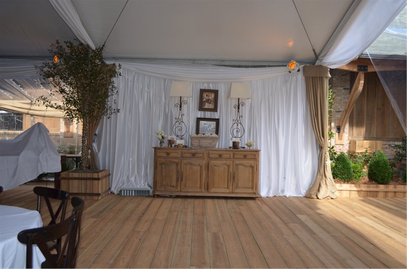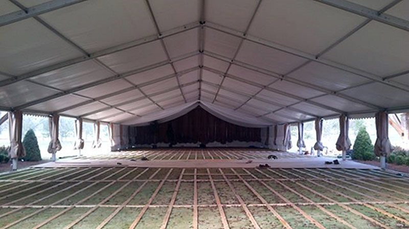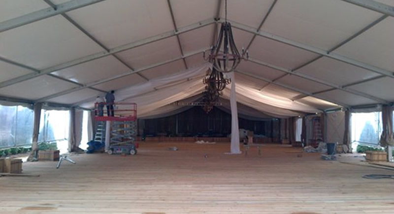 This was the beginning of a huge tent wedding. This tent was 200’ long x 60’ wide. We were asked to only cover the frame of the tent. The center reach to the ceiling was well over 26’. The floors were constructed using 2 x 4s, which allowed us to drive over the flooring using heavy lifts. The entire ceiling took 14 hours to hang.