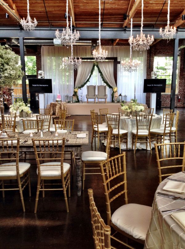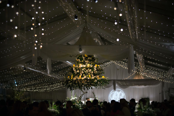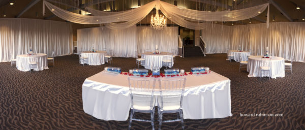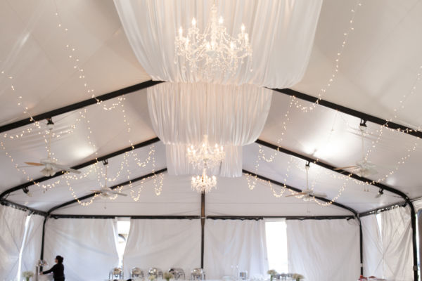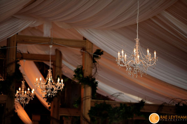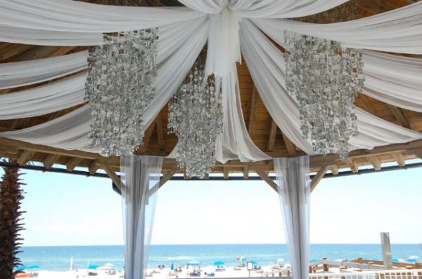 Chandeliers can add a striking visual effect to your Ceremony, Reception, Dance Floor, or anywhere you’re looking to add the unexpected. We have several different styles and sizes of Chandeliers to fit your Wedding or Event. Our most popular Chandelier is an iridescent crystal-like round style available in 26” and 40” sizes. My design background allows me to create a one of a kind look using one Chandelier or arranging multiple Chandeliers in a way that will leave you breathless. Imagine hanging a row of Chandeliers on the stage at different heights, a dozen Chandeliers over the dance floor, or Chandeliers down the aisle. To complement and complete the look we can use fabric, beading and additional lighting.