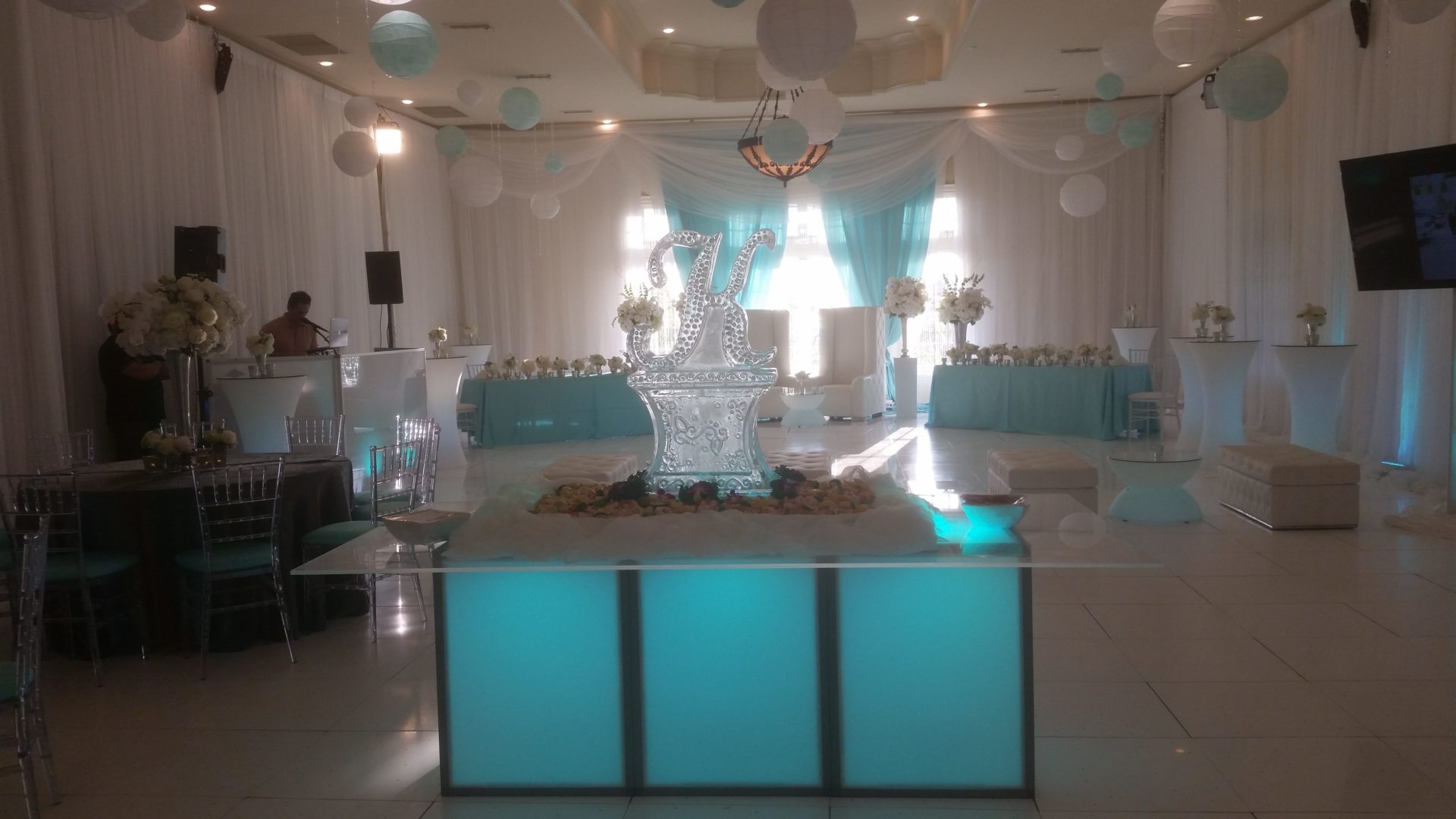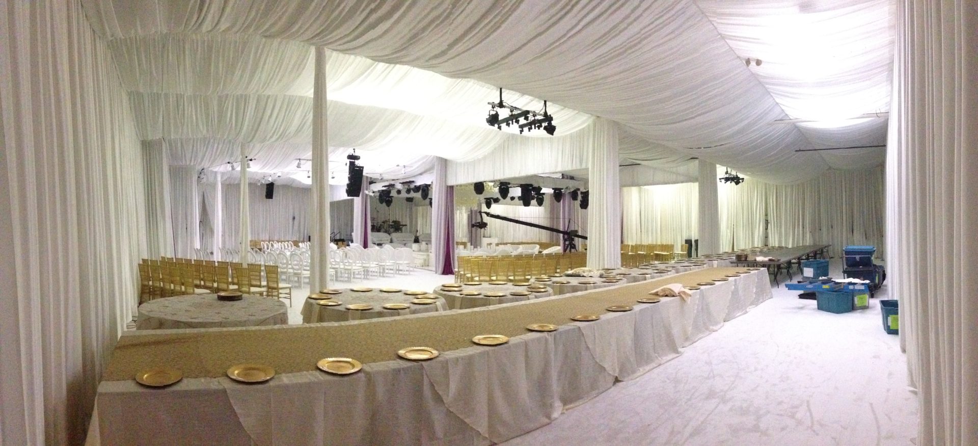 The use of white drapery combined with the creative lighting provides versatility with minimal additional cost. You can change the appearance of your event with a simple change in light color, creating a different look for each of your needs.